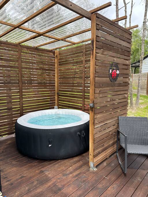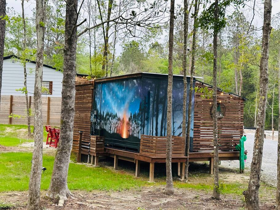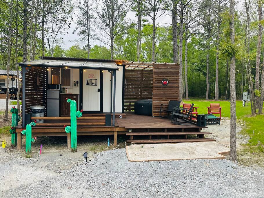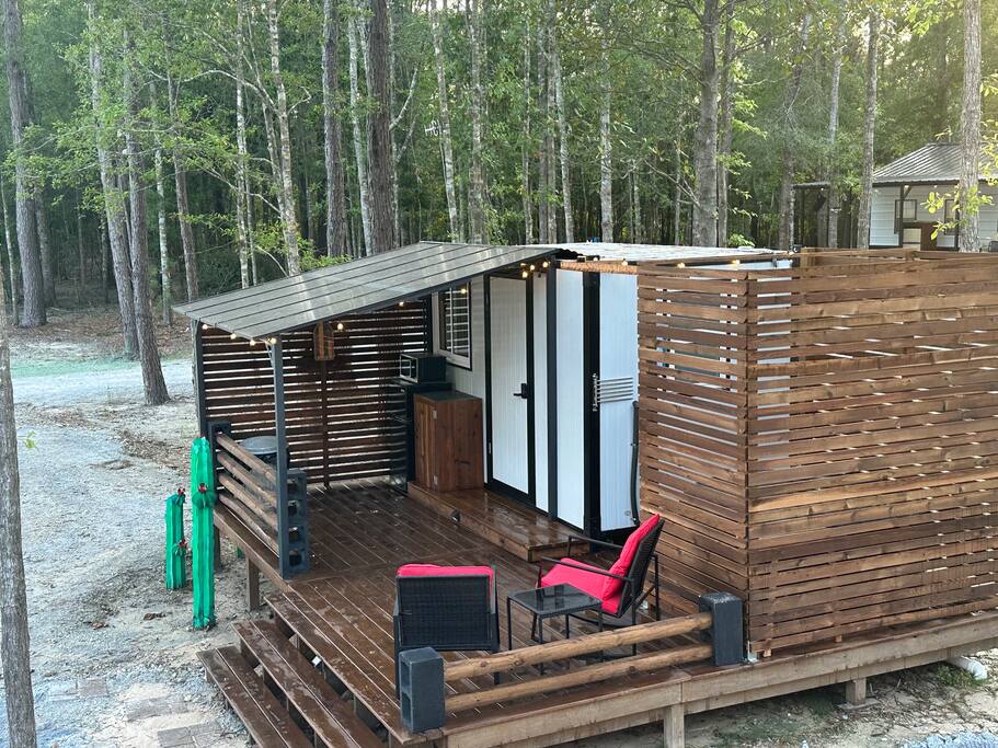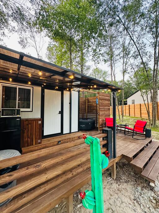 Welcome to “The Hunters Hut”, a private, cozy tiny space in the Pineywoods of Kountze, Texas, just 5 yards from the main house yet private. Relax on the porch with your favorite beverage, or unwind in your own private hot tub. Enjoy the shared dock at the pond, or try catch-and-release fishing (bring your own gear). Build your own private fire for the perfect outdoor evening—the adventure of camping with the comfort of glamping. Spacious for one, cuddly for two.