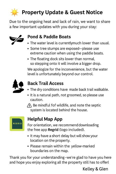 Guests at The Hunters Hut have full access to our scenic pond and its surrounding areas. Enjoy catch-and-release fishing, but please bring your own equipment. You can also explore the pond by paddle boat, adding to your outdoor experience. You are also free to walk around the pond at your leisure. While there are two other Airbnb accommodations located on the property behind The Hunters Hut, the pond and its amenities are open for everyone to enjoy.