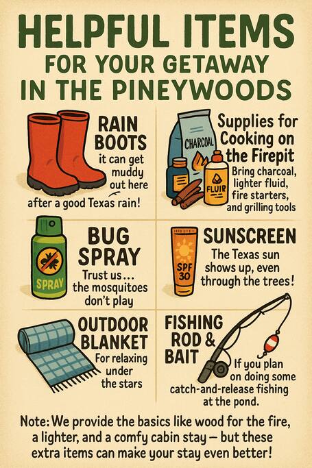 Welcome to your retreat at our charming Hunter’s Hut property — one of three delightful Airbnbs where tranquility meets rustic charm. Nestled among the tall pines of Kountze, Texas, The Hunter’s Hut is a cozy woodland getaway designed for those who love the outdoors but still enjoy the comforts of home. Relax by your own fire pit under a blanket of stars, sip your morning coffee on the porch, and let the sounds of nature wash your worries away. Our scenic pond and dock offer a peaceful spot for catch-and-release fishing (just bring your own gear!). While paddle boats are currently unavailable due to low water levels, the nature trail is open and perfect for a quiet walk surrounded by the beauty of the Pineywoods. You may also notice a few friendly animals in their own gated area during your stay — they’re part of what makes our property so special! 🐐 If you’d like to feed or visit them, just reach out to us first and we’ll be happy to assist. For everyone’s safety (and theirs), we kindly ask that you don’t enter the gated area or approach them on your own. While there are two other Airbnb units on the property, each maintains its own privacy, so you can relax and enjoy your time in peace. Whether you’re visiting for a romantic getaway, a peaceful escape, or just a break from the hustle and bustle, The Hunter’s Hut offers the perfect blend of comfort, charm, and East Texas nature. We look forward to welcoming you and helping you create wonderful memories at our little slice of Pineywoods paradise.